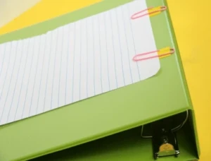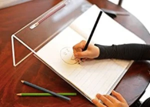 The ideal position is both feet flat on the floor, the back resting against the chair and the arm resting on the desk ideally 2 inches above the elbows when flexed 90°. The posture is called 90/90/90 because of the angle we want the child to form at the hips, knees, and ankles. The best writing surface is a slanted one. This will help keep the head upright and the forearm and wrist in optimal writing positing. An easy modification is to place a 4-inch 3-ring binder turned sideways or a slant board on the child’s desk.